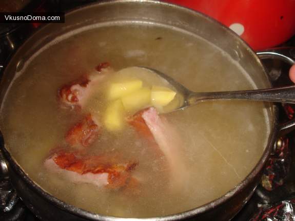 Процеженный бульон вернуть в кастрюлю. Добавить мясо, ребрышки и вернуть на огонь. Варим. Минут через 20 добавить картофель. Спустя 10 минут добавить капусту. Спустя еще 10 минут добавить зажарку.