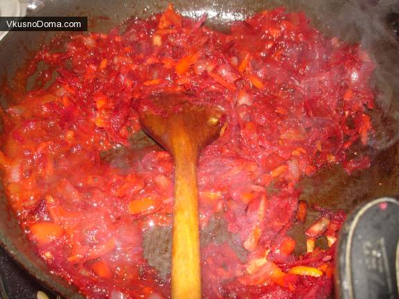 3. Приготовим зажарку. Для этого на растительном масле обжарить лук, морковь, болгарский перец, буряк, добавить немного томатов и потушить 10 минут на слабом огне.