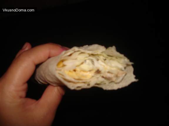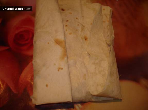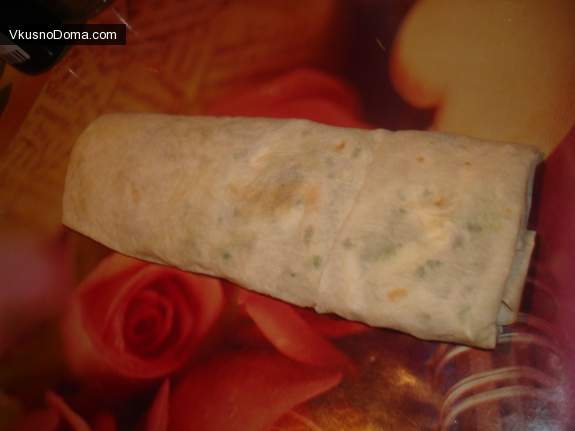 Накрываем нижней частью лаваша. Таким образом, начинка получается как в кармане. Сворачиваем в ролл...