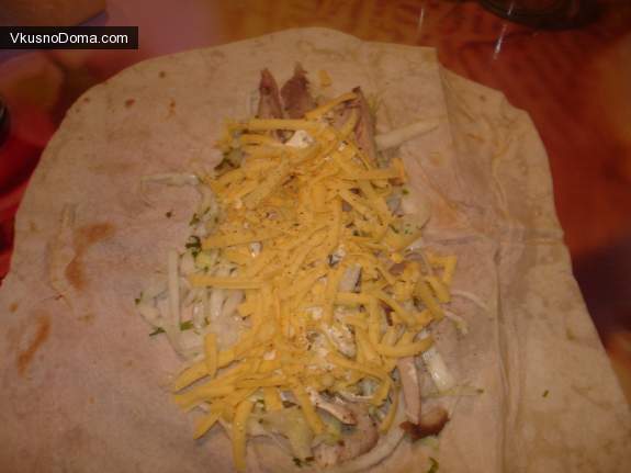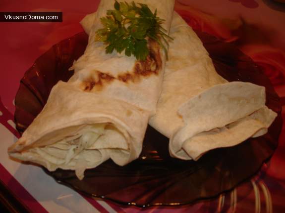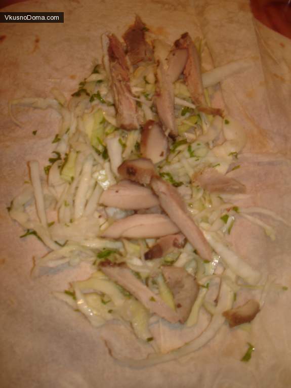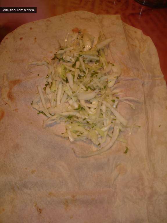 3. На лист лаваша выкладываем порцию капусты или салата