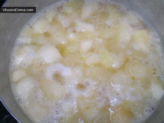 Приготовление: Дины вымыть. Очистить от кожуры и семян. Нарезать на произвольные кусочки. Сложить в кастрюлю и залить водой. Довести до кипения.