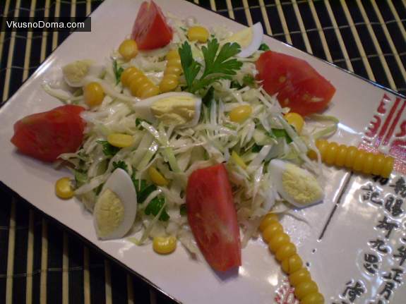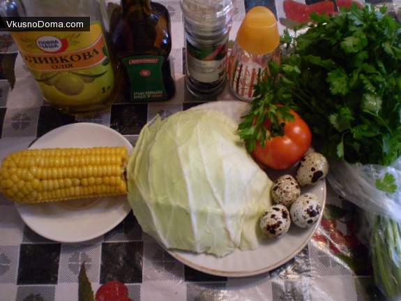 И просто украсить помидорами, перепелинными яйцами, кукурузой. Вот и всё, нарядный и легкий овощной салат готов! Приятного!