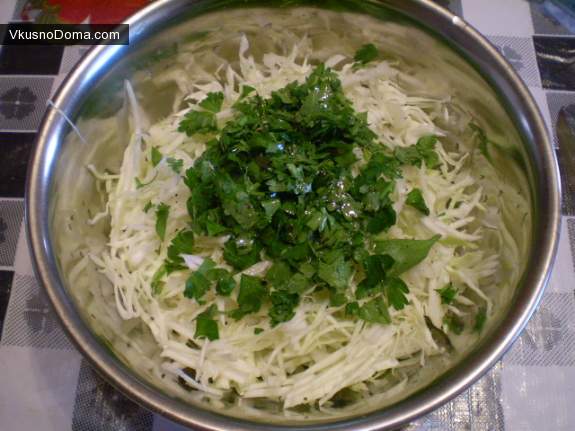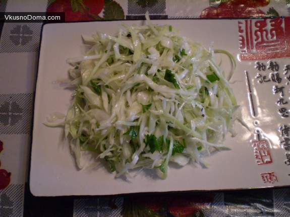 Капусту мелко нашинковать. Добавить мелко порезанную зелень. Посолить. Заправить капусту рисовым уксусом и оливковым маслом, соотношении 1:1, на одну чайную ложку масла одна чайная ложка уксуса. Перемешать салат.