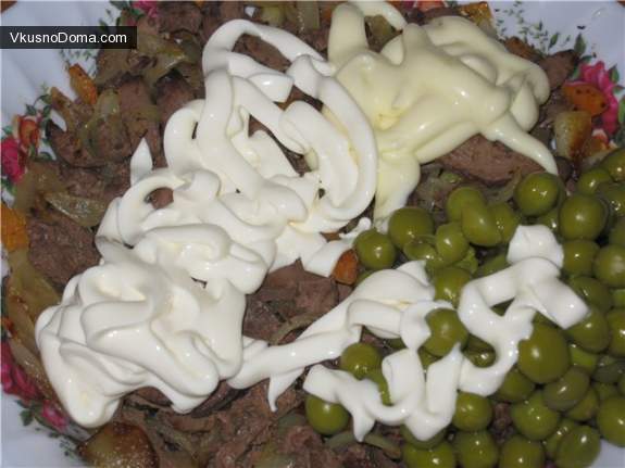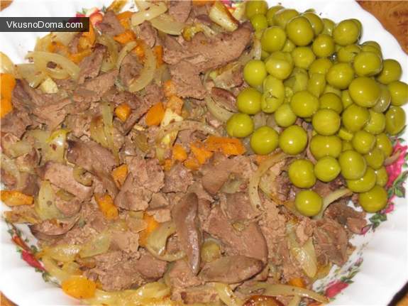 Для начала печень промыть и отварить. Потом нарезать небольшими брусочками. Лук нарезать полукольцами и обжарить на сковороде до полупрозрачности, затем добавить тертую на крупной терке морковь и жарить до готовности. С горошка слить жидкость. В глубокой миске перемешать печенку, лук, морковь и зеленый горошек.